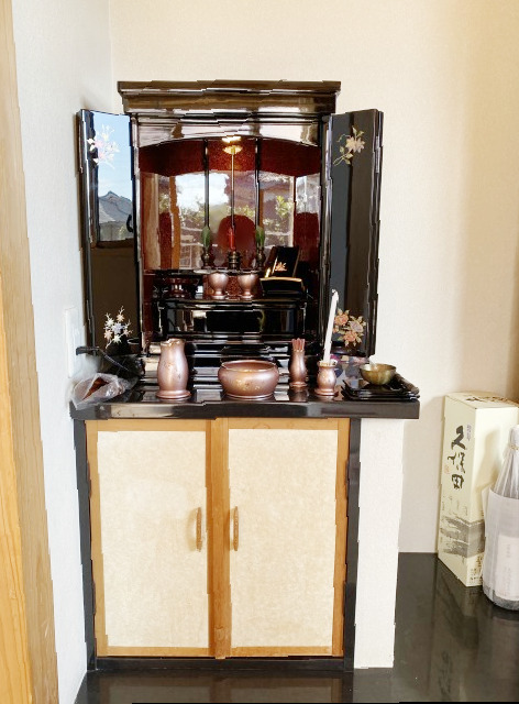 この度はご縁を頂きまして誠にありがとうございました。「仏壇を安置するスペースは作っていたけれど、今まで準備をしてこなかったので気になっていた」とのこと。ご宗派に合う塗りが施されたお仏壇を、ひと目で気に入られました。仏具も花柄の具足や過去帳を選ばれ統一感のあるご荘厳となりました。当店のすぐお近くにお住まいですので、いつでも遊びに来てくださいませ。