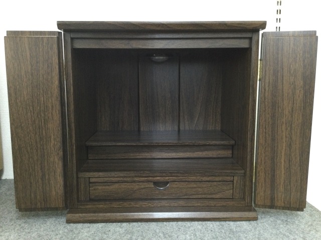 古いお仏壇の処分のご相談で来店されました。「今まで手を合わせてきた仏様を、小さいお仏壇でよいので移せばご先祖様も喜ばれると思いますよ」とお話させていただきました。小型の家具調仏壇をご購入くださいました。今後も、どうぞお気軽にお立ち寄りください。