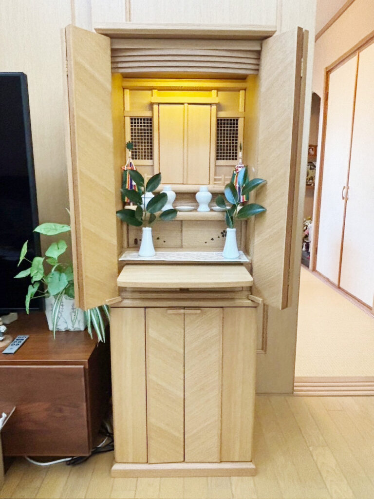I様には以前もお世話になりました。今回は神道壇をご希望でした。お社の造りや色などで気に入られた神道壇が2基ありました。どちらもご自宅に持ち込ませていただきました。家具調の神道壇を選ばれました。ご先祖様も喜ばれていることでしょう。ご縁をいただき、ありがとうございます。