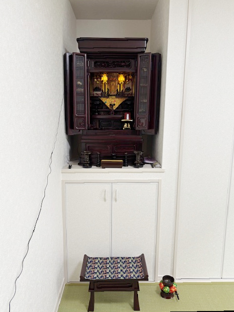 ご夫婦で来店されました。最初は家具調仏壇を検討されていました。仏具一式がサービスとなる唐木仏壇をおすすめすると、彫刻や障子に重厚感のあるものを選ばれました。ご新築の仏間に納めさせていただきました。お宅の雰囲気にとても合っていました。これから末永く手を合わせていただけたらと思います。