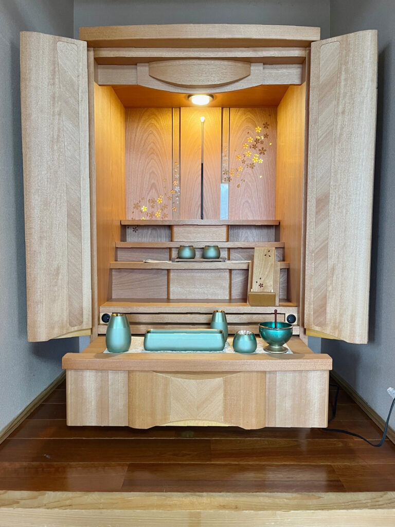 仏間に合うお仏壇をお探しでした。唐木仏壇や家具調仏壇を見て回られました。写真のお仏壇の材質をとても気に入られ選ばれました。仏間の色やお部屋の雰囲気にとても合っていました。素敵な空間になりましたね。これから末永くご家族を明るく照らし見守ってくれることでしょう。ご縁をいただき、ありがとうございました。