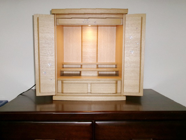 お母様を亡くされ来店されました。「手元供養のような形で自分の部屋に安置したい」とご希望でした。板位牌のご提案も含め小型仏壇をおすすめいたしましたら、たいへん気に入っていただけました。仏具もいろいろご相談をいただいております。素敵な仏壇空間に仕上がるよう、これからもたくさんお話をお聞かせください。