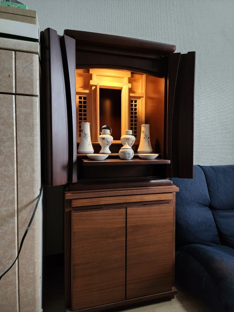今まで神道と仏教の両方でお参りされていたそうです。「今からは神道でまつりたい」とのご相談でした。「デザインが良い」とマンションに良く合う家具調の神道壇を購入されました。
