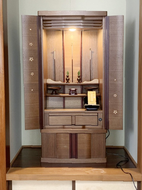 旦那様をなくされたO様。四十九日法要を済まされた後に、ご家族の皆様と一緒に来店されました。仏間の色に合わせウォールナットの家具調仏壇を選ばれました。少し落ち着いてからの納品をご希望されたので2月に入ってからお届けいたしました。納められたお仏壇をご覧になり「色がピッタリで良かった」と喜んでいらっしゃいました。この度のご縁に感謝いたします。今後とも長いお付き合いを、よろしくお願いいたします。ありがとうございました。