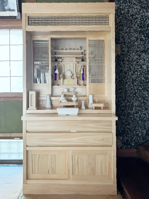 「新しく神道壇を購入したい」と、ご夫婦で来店されました。神具を置く場所が広く引き出し付で収納もたくさんできる先祖棚を、ご夫婦で気に入られました。納品の時、奥様がたいへん喜んでいらっしゃいました。嬉しく思います。この度は「佛壇の古屋鋪 鹿屋店」とのご縁をいただき、誠にありがとうございます。